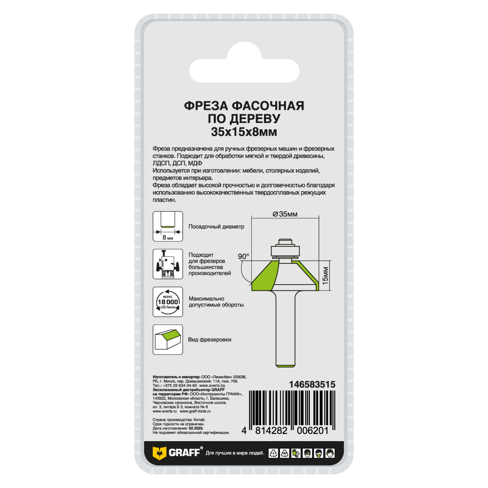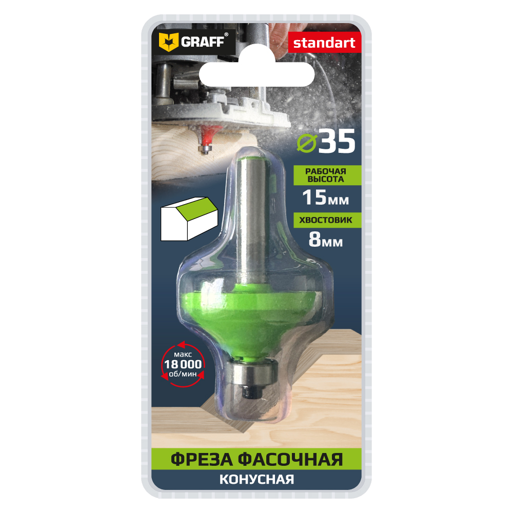 ОписаниеФреза фасочная по дереву 35х15x8 мм GRAFF с цилиндрическим хвостовиком применяется для обработки всех пород дерева.