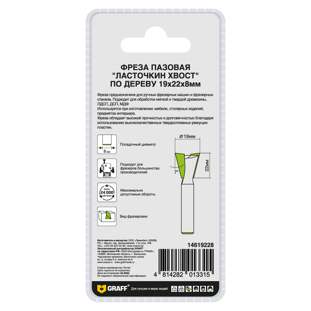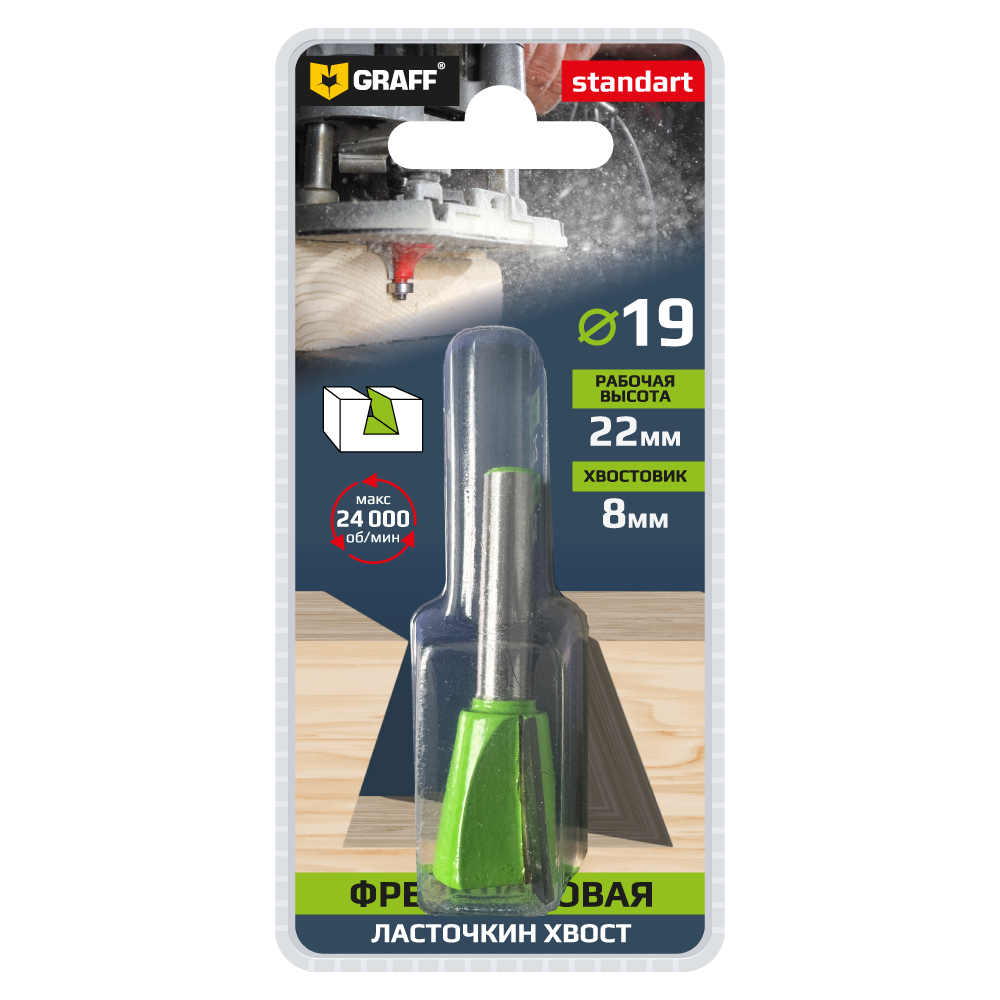 Фреза пазовая "ласточкин хвост" по дереву 19х22х8мм GRAFF: