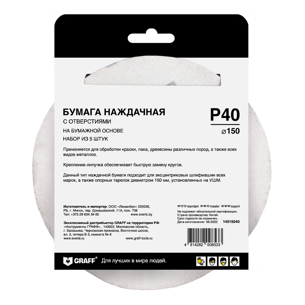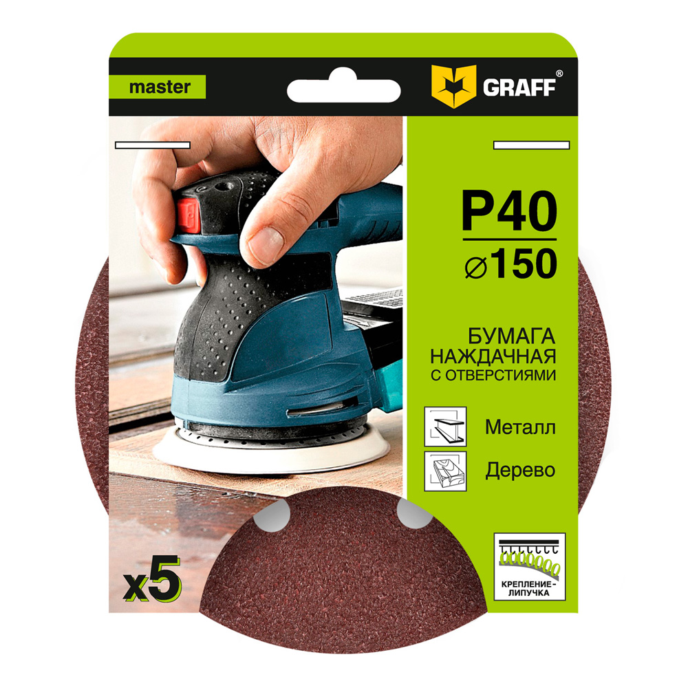 Наждачная бумага 150 мм P40 8 отверстий 5 шт. в блистере GRAFF