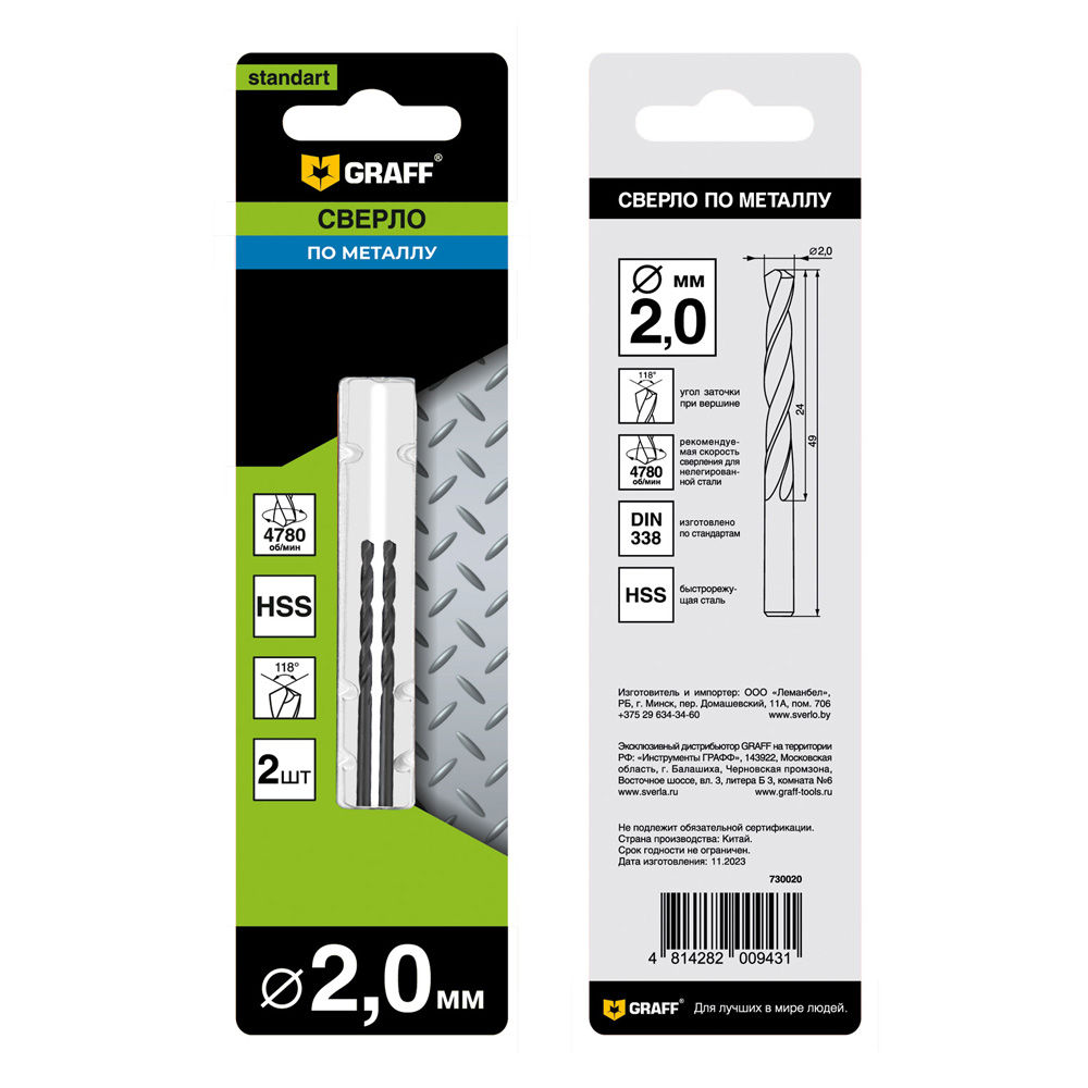 Сверло по металлу 2,0 мм парооксидированное GRAFF в блистере