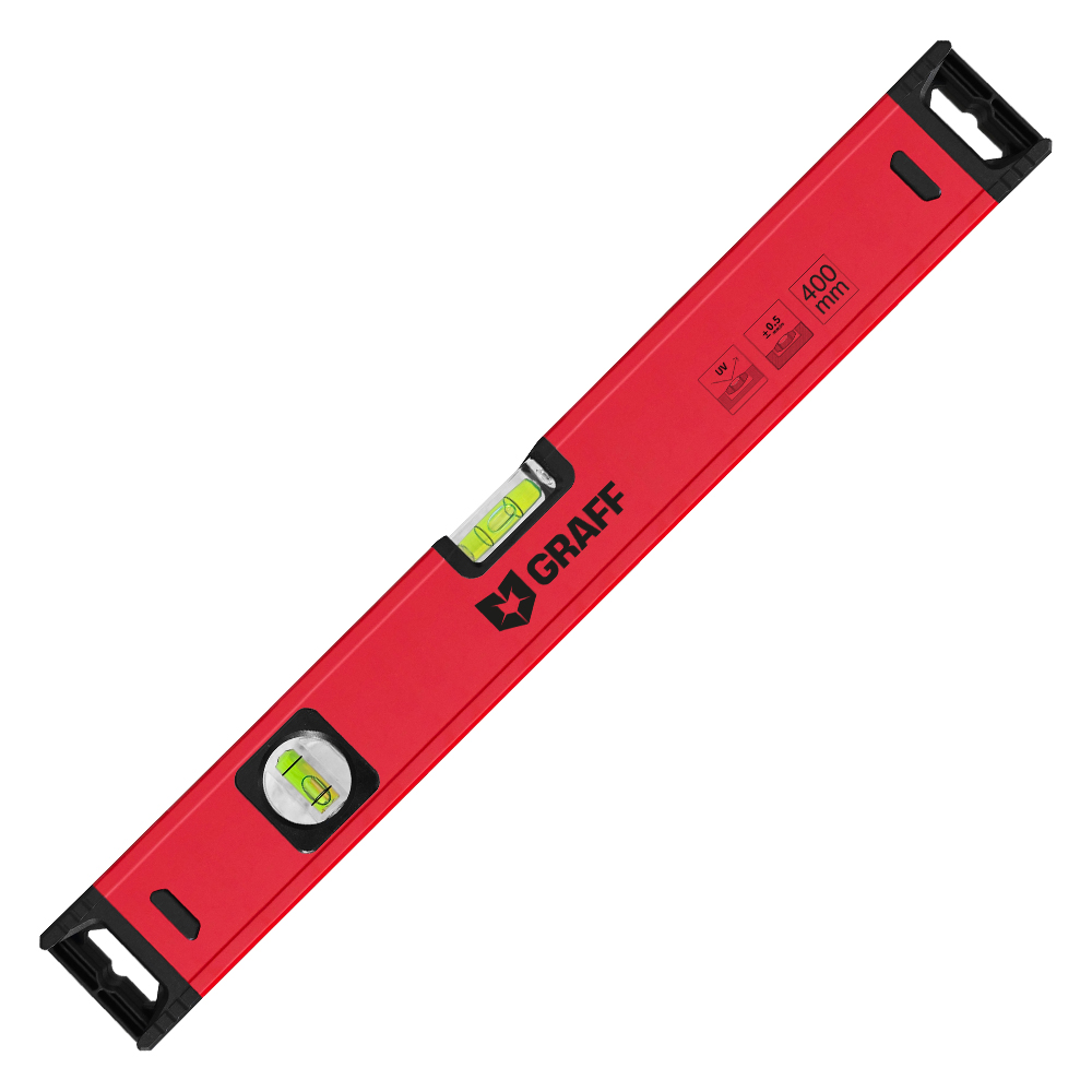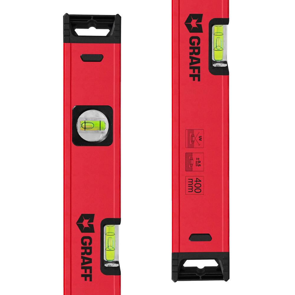 ОписаниеУровень строительный усиленный 400 мм, на 2 глазка Expert GRAFF.